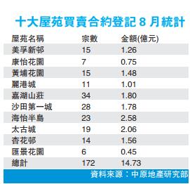 中原地產研究部高級聯席董事黃良昇指出,8月份的登記是反映7月期間的市况,顯示受到政府六招房策影響,二手樓市氣氛放緩,買家多持觀望態度,加上一手新盤連環推售,搶去二手購買力,導致傳統屋苑買賣回落。十大屋苑交投連跌三個月,累計跌41.5%,并回落至200宗以下水平。