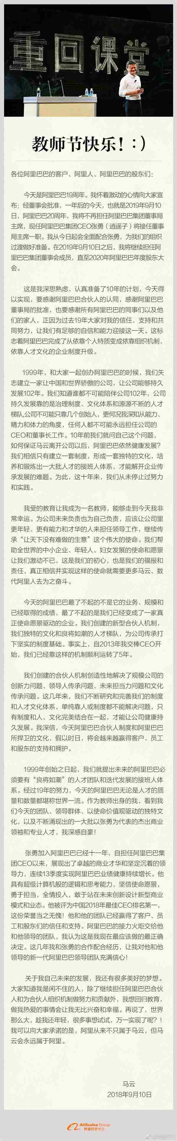 【香港商报网讯】今天是教师节,马云通过阿里巴巴官方微博发布公开信宣布:一年后的阿里巴巴20周年之际,即2019年9月10日,他将不再担任集团董事局主席,届时由现任集团CEO张勇接任。谈及自己未来的发展,马云表示,他还有很多美好的梦想,除了继续担任阿里巴巴合伙人和为合伙人组织机制做努力和贡献外,马云想回归教育,“做我热爱的事情会让我无比兴奋和幸福。”