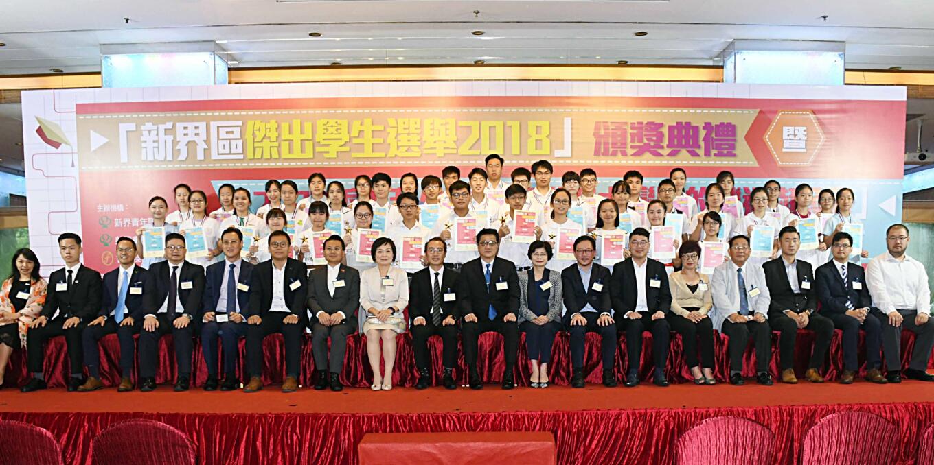 新界區傑出學生2018頒獎典禮得獎學生與嘉賓合照。