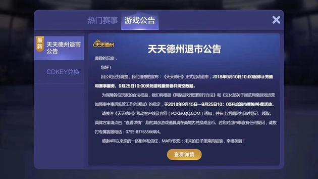 9月10日上午,腾讯棋牌类游戏“天天德州”今日发布退市公告称,2018年9月10日10:00起停止充值和赛事服务,9月25日10:00关闭游戏服务器并清空数据。