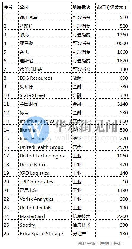 鉴于此,摩根士丹利列出了26家公司,认为他们处于“数据时代驱动的生产力爆发的前沿”。其中既包括亚马逊、奈飞、特斯拉等知名科技股,也包括贝莱德等金融机构以及霍尼韦尔等工业企业。