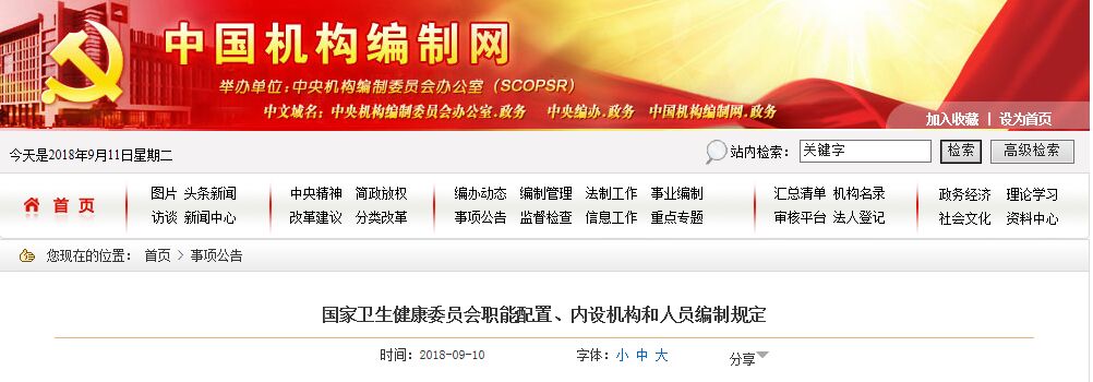 9月10日晚,据中国机构编制网,国家卫生健康委员会职能配置、内设机构和人员编制规定,即“三定”方案正式公布。