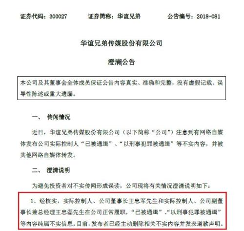 9月10日晚间,华谊兄弟发布澄清公告称,实际控制人、公司董事长王忠军和实际控制人、公司副董事长兼总经理王忠磊在公司正常履职,“已被通缉”、“以刑事犯罪被通缉”等内容纯属不实信息。目前,发布者已经主动删除相关不实内容并发表道歉声明。