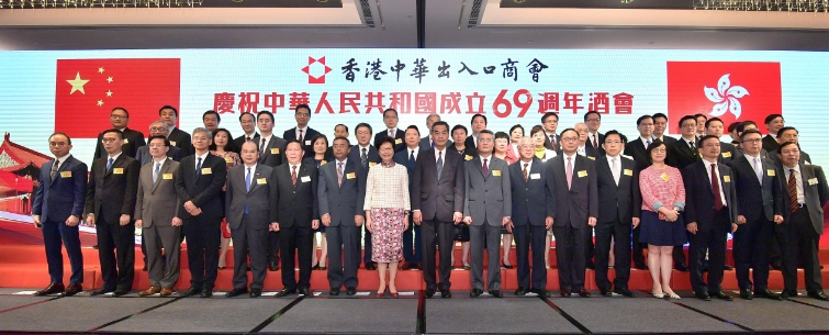【香港商報网訊】記者余江強報道:香港中華出入口商會昨日於金鐘萬豪酒店舉行慶祝中華人民共和國成立69周年酒會,全國政協副主席梁振英、行政長官林鄭月娥、中聯辦副主任黃蘭發、外交部駐港公署副特派員楊義瑞等多位政界、商界人士出席,冠蓋雲集,數百來賓濟濟一堂,場面熱鬧。