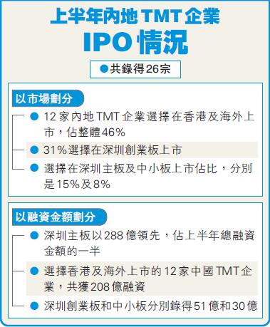 上半年,26宗内地TMT企业中,12家选择在港及海外上市。
