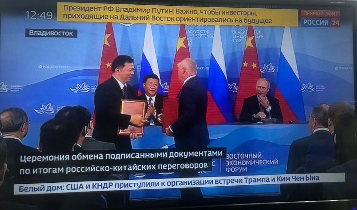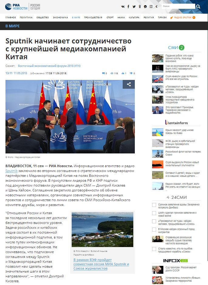 9月11日,在中国国家主席习近平和俄罗斯总统普京的共同见证下,中央广播电视总台台长慎海雄与今日俄罗斯国际通讯社社长基谢廖夫在俄罗斯远东城市符拉迪沃斯托克市签署了《中央广播电视总台与今日俄罗斯国际通讯社国际战略合作协议》。