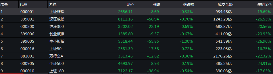 截至收盘,沪指收报2656.11点,收于2014年11月以来最低水平,跌0.33%,成交额934.5亿元,继续刷新31个月新低。