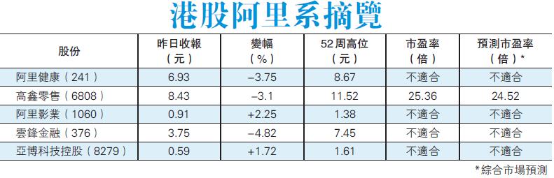因為對「同股不同權」的訴求,使阿里與當年未接受這制度的香港股市失之交臂。雖然阿里沒有在香港上市,但很多阿里系企業選擇港股市場。馬雲將卸任的消息傳出當天,港股阿里系個股多數應聲下跌,阿里健康(241)一度跌8.28%、高鑫零售(6808)跌3.64%、阿里影業(1060)跌2%。