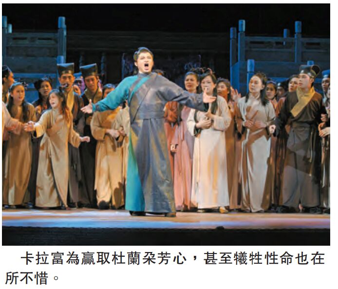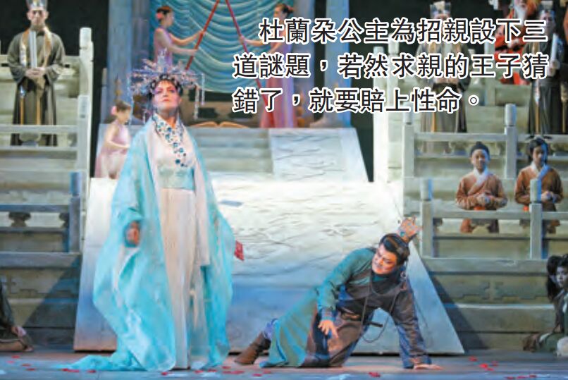 浦契尼一生從沒踏足過中國,對遠古東方的想像僅來自藝術和文學作品,在完成《杜蘭朵》前便與世長辭,后由作曲家阿爾方諾根據其手稿續寫成劇。該劇發生在古代中國皇宮,以一場杜蘭朵公主的招親、三道謎題為故事主軸,并附帶一個殘忍的條件,若然求親者破解不了公主的三道謎題,則要賠上性命。正如許多偉大的歌劇,總會有個對女主角一見鍾情并不惜一切地追求她的王子,這次登場的是機智神勇的卡拉富王子,迂回曲折地解開了杜蘭朵公主冰封的心,最終尋見一個名字——愛。