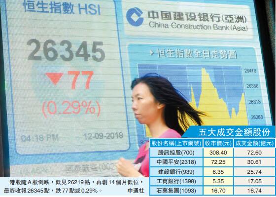 【香港商報網訊】記者吳天淇報道:港股連跌第6日,累計瀉1628點或5.82%,逼近26000點大關。恒生指數高開40點後跟隨A股倒跌,最多跌203點,低見26219點,再創14個月低位;之後好淡爭持,收市報26345點,跌77點或0.29%。國企指數收報10238點,跌94點或0.91%,主板全日成交948億元。分析認為,港股尋底格局未變,惟短線不排除出現技術性反彈。