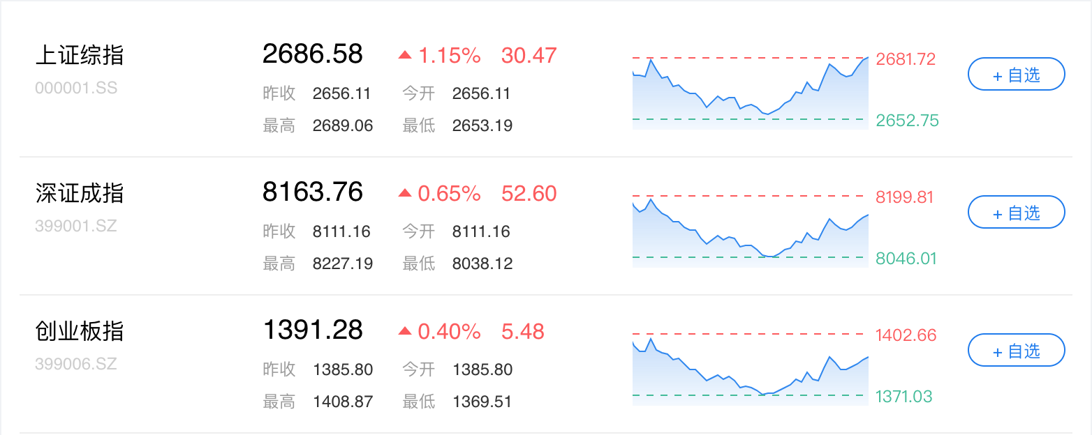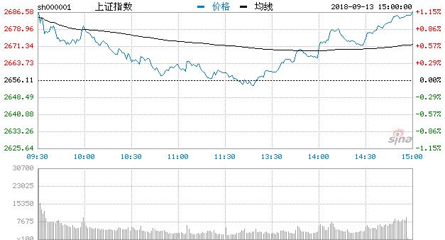 今天收盘, 沪指收报2686.58点,涨1.15%,成交额1125亿(三个交易日来首次突破1000亿)。深成指收报8163.76点,涨0.65%,成交额1484亿。创业板收报1391.28点,涨0.40%,成交额485亿。