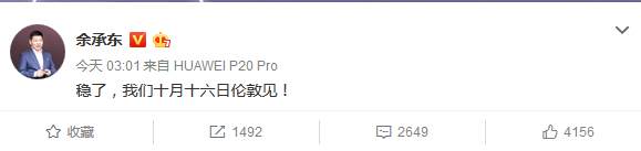 国产手机厂商再一次按捺不住,开始在微博中群嘲苹果,首先是余承东凌晨发布微博,称:稳了,我们十月十六日伦敦见。