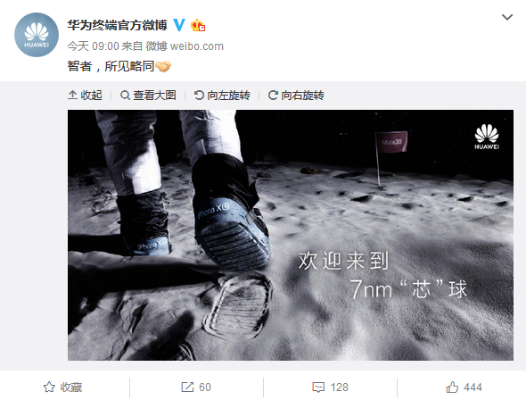 华为终端微博紧跟其后,针对A12芯片的7纳米工艺制程表示“智者,所见略同”,并配上一张插着Mate20旗子星球的图片,而穿着iPhone XS鞋子的人才刚刚踏上星球,并配上文字“欢迎来到7nm‘芯’球”。