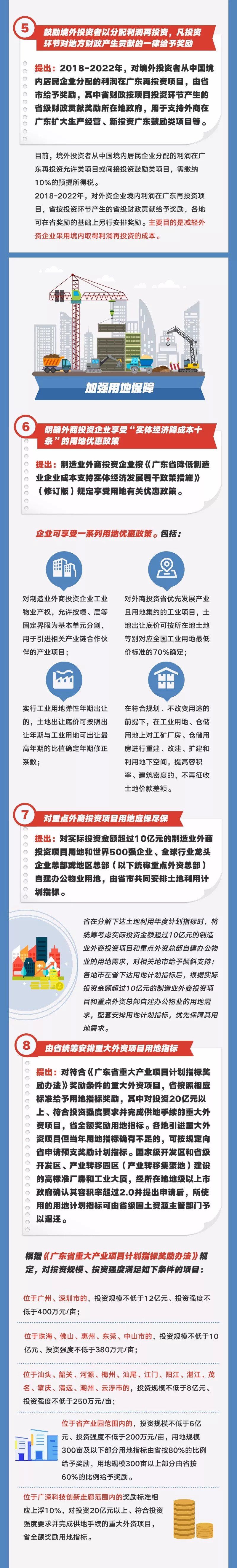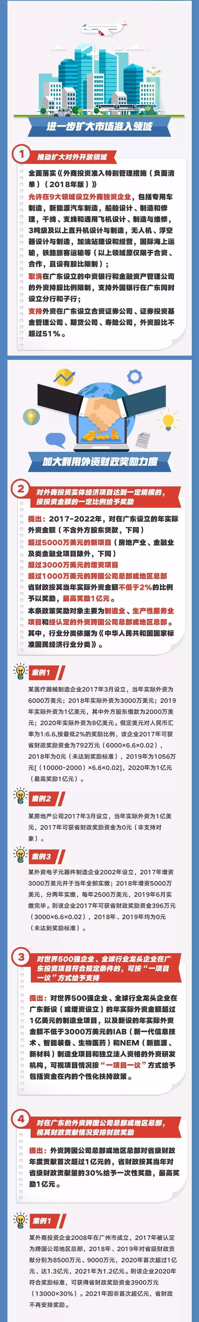廣東省商務廳副廳長陳越華表示,廣東「外資十條」修訂版共10個方面38條政策,重點圍繞基層和外商在市場准入、財稅、用地等方面的核心關切,在進一步擴大市場准入領域、加大利用外資財政獎勵力度、加強用地保障、支持研發創新、加大金融支持力度、加大人才支持力度、加強知識產權保護、提升投資貿易便利化水平、優化重點園區吸收外資環境、完善利用外資保障機制等方面,提出了一系列針對性更強、支持力度更大、更加務實管用的新舉措,每一條都具有很高的「含金量」。