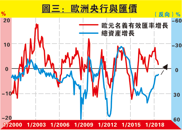 至於金融市場方面,先看股、匯。圖二顯示,歐洲央行總資產增長領先歐洲STOXX五十指數增長約一年半,整體大致同向。若央行停止提供新增流動性,料資產價格難以保持上升動力,因此股市下行壓力較大,按圖中紅色虛線可見其按年增長將處於負水平。再看匯價;圖三顯示,歐洲央行總資產增長與歐元增長大致呈明顯反比,而兩者並無先後關係。然而退出量寬意味總資產下降,貨幣政策漸收緊下,匯價應見回升,若按圖中箭嘴預示,料歐元增長將在未來三個月見上升。