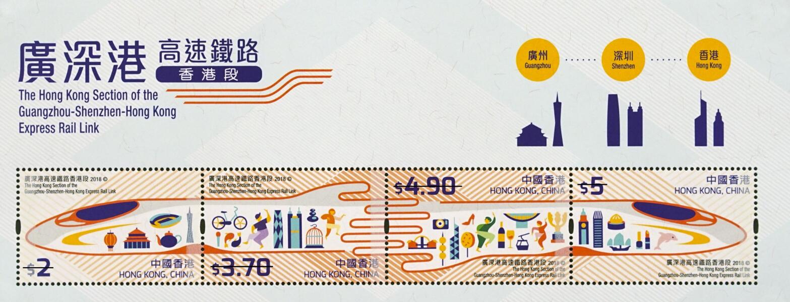 以高鐵列車貫串四枚邮票,并由左至右分别展示广州、深圳和香港的特色。