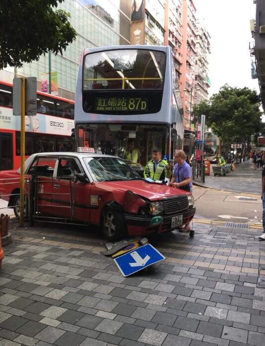 昨日上午8時15分,姓黃車長駕駛87D路線雙層九巴,沿尖沙咀彌敦道慢線南行,當途至近麼地道時,一輛在快線行駛之的士,突然切線駛往慢線,疑欲左轉入麼地道,未料巴士收掣不及,猛撞向的士車身,的士再鏟上行人路,撞毀約3米鐵欄和一塊路牌,幸當時行人路上無人,否則後果不堪設想。