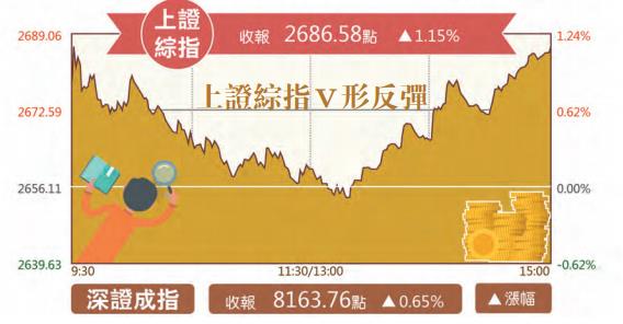 當日,上證綜指以2679.21點高開,全天呈現「V形」走勢,最終收報2686.58點,較前一交易日上漲30.47點,漲幅為1.15%;深證成指收報8163.76點,漲52.60點,漲幅為0.65%;創業板指高開低走,午後回升,最終報收1391.28點,漲5.48點,漲幅0.40%;中小板指數漲0.68%,以5555.96點收盤。