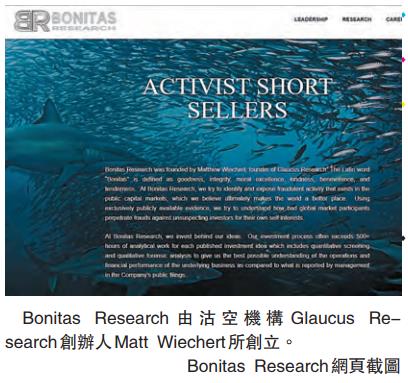 BonitasResearch由著名沽空機構GlaucusResearch創辦人MattWiechert創立,7月曾狙擊浩沙國際(2200)。而GlaucusResearch曾經狙擊過11隻港股,以民企為主,Glaucus曾狙擊除牌兼清盤的中金再生(除牌前編號773)、以及停牌至今的旭光(067)。Glaucus研究部總監SorenAandahl在今年5月時曾表示,加息周期內股市會更趨波動,差異化擴大,令壞公司更易現形,是沽空的「黃金時代」。