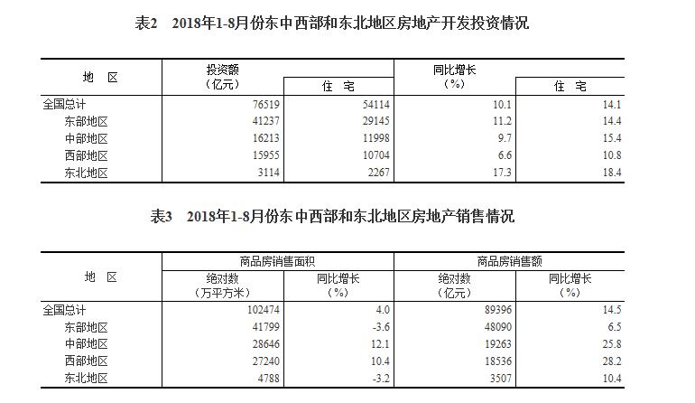 1-8月份,东部地区房地产开发投资41237亿元,同比增长11.2%,增速比1-7月份回落0.3个百分点;中部地区投资16213亿元,增长9.7%,增速回落0.7个百分点;西部地区投资15955亿元,增长6.6%,增速提高0.8个百分点;东北地区投资3114亿元,增长17.3%,增速回落0.4个百分点。