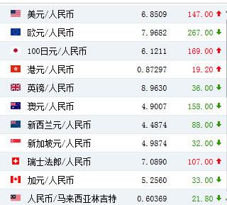 中国人民银行授权中国外汇交易中心公布,2018年9月17日银行间外汇市场人民币汇率中间价为:1美元对人民币6.8509元,1欧元对人民币7.9682元,100日元对人民币6.1211元,1港元对人民币0.87297元,1英镑对人民币8.9630元,1澳大利亚元对人民币4.9007元,1新西兰元对人民币4.4874元,1新加坡元对人民币4.9874元,1瑞士法郎对人民币7.0890元,1加拿大元对人民币5.2560元,人民币1元对0.60369马来西亚林吉特,人民币1元对9.9174俄罗斯卢布,人民币1元对2.1789南非兰特,人民币1元对163.35韩元,人民币1元对0.53582阿联酋迪拉姆,人民币1元对0.54720沙特里亚尔,人民币1元对40.7538匈牙利福林,人民币1元对0.54024波兰兹罗提,人民币1元对0.9361丹麦克朗,人民币1元对1.3202瑞典克朗,人民币1元对1.2037挪威克朗,人民币1元对0.89825土耳其里拉,人民币1元对2.7543墨西哥比索,人民币1元对4.7651泰铢。