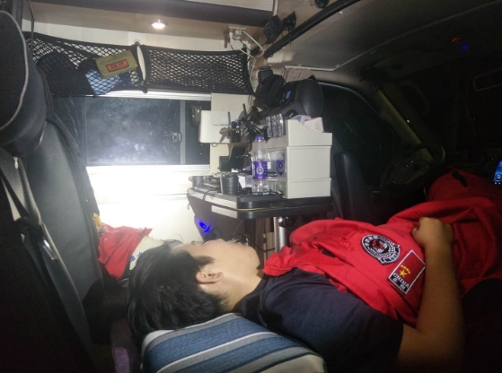 昨天凌晨3时许,在车里临时休息一下的抢险队员,旁边就是办公设备。