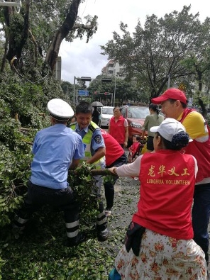 17日,龙华街道继续组织工作人员对道路倾倒树枝进行切割搬离,迅速采取措施清理主要道路上倒伏的树木,现已清理倒伏树木约48棵, 使人民路、公园路,兰联路,创业路,民清路,中环路,宝华路交通恢复。龙华街道严格按照防台风应急响应的要求开展工作,安排工作人员前往各路段现场巡查,全力以赴做好清淤清障、抢修线路、排水排涝等工作,迅速恢复辖区正常秩序,要求供电公司、水务公司、移动公司、联通公司、电信公司要全力开展线路巡查,确保尽快恢复供电、供水、通信。