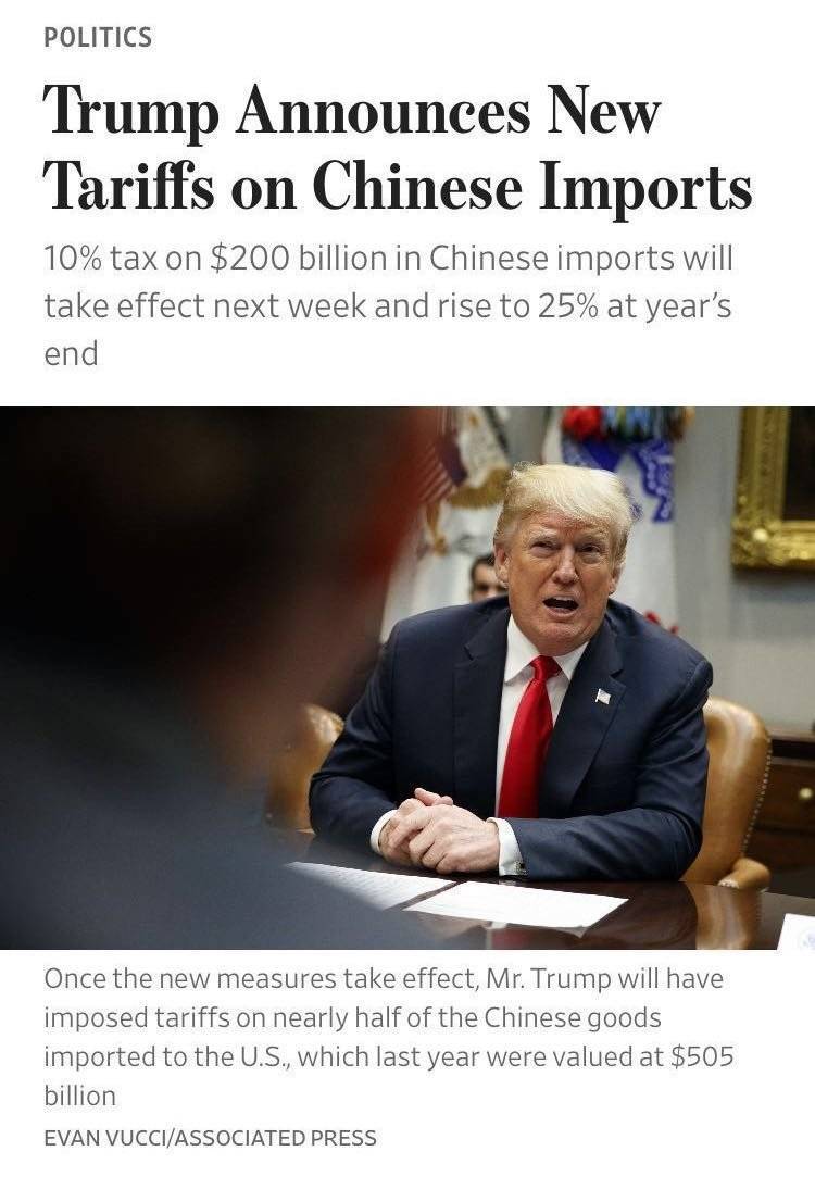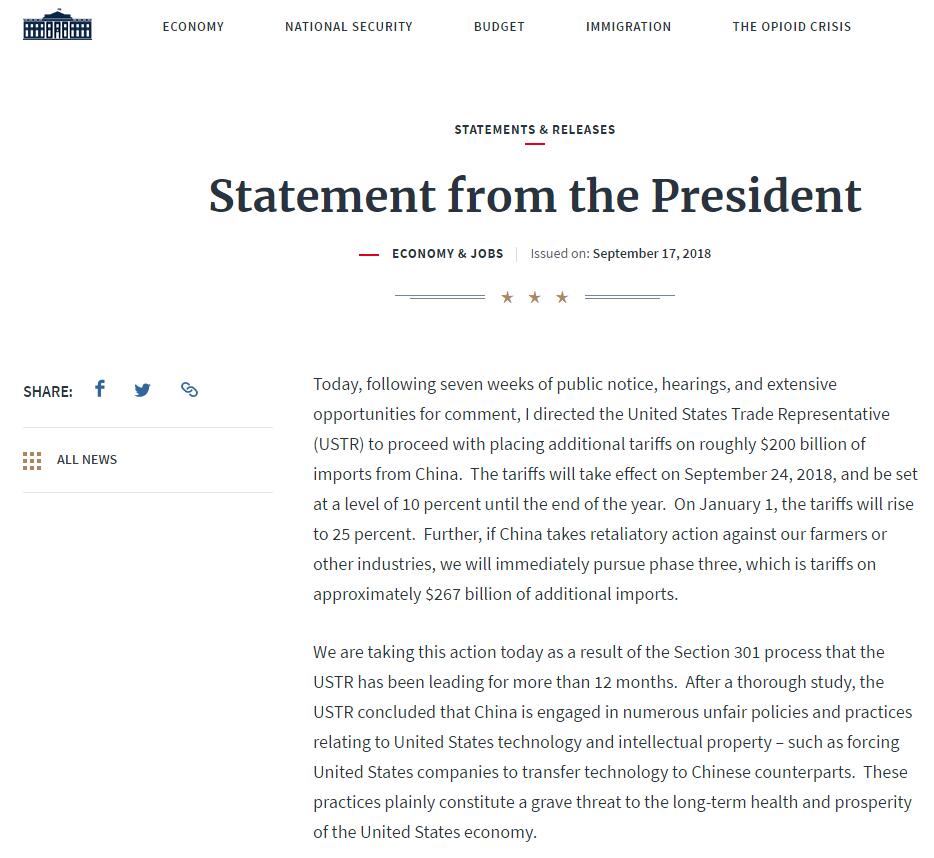 在此之前,美国已对价值500亿美元的中国产品加征关税。这意味着将近一半的中国对美出口产品很快将被加征关税。