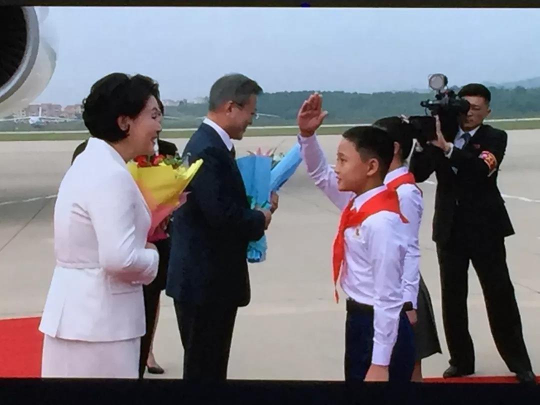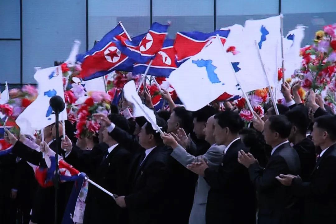金正恩在事先并未通知的情况下突然前往迎接,给了人们一个惊喜。金正恩前往机场迎接,朝鲜民众手持朝鲜国旗和朝鲜半岛旗欢迎文在寅。