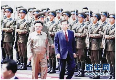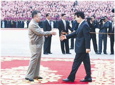 金正日与卢武铉见面后,两人亲切握手、互致问候,随后在广场检阅了朝鲜人民军三军仪仗队↓↓