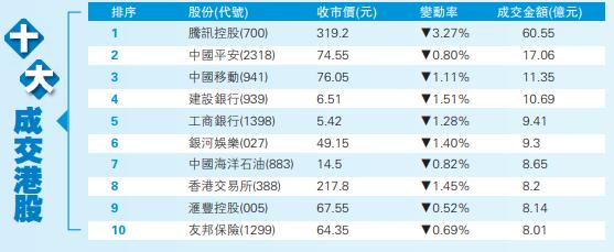 重磅藍籌全線回吐,股王騰訊(700)低見318.6元,收報319.2元,跌3.3%,拖低恒指81點。金融股下跌,友邦保險(1299)跌0.6%,汇豐控股(005)跌0.5%,四大內銀股跌0.5%至1.5%,中國平安(2318)跌0.8%;港交所(388)跌1.4%。由於新款iPhone預訂反應一般,手機設備股顯著回吐,瑞聲科技(2018)及舜宇光學(2382)挫5.9%及5.2%,是表現最差兩隻藍籌。