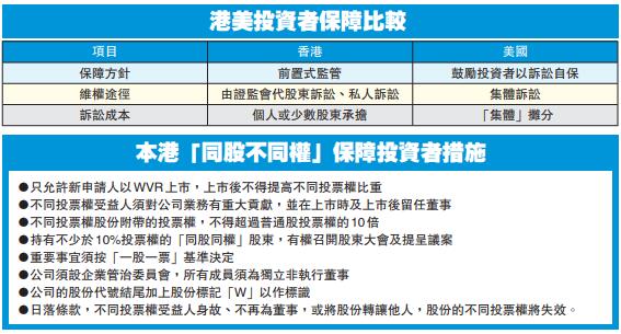 美國很早以前就容許公司以同股不同權架構(WVR)上市,京東就是一例。香港第一隻WVR上市的公司就是小米(1810),而香港快將有第二隻WVR公司美團(3690)上市,市場一直有意見認為本港對WVR公司的投資者保障不足,因香港缺乏集體訴訟機制,擔心管理層淩駕於小股東,損害小股東利益。事實上,香港與美國對投資者保障的制度大不同。