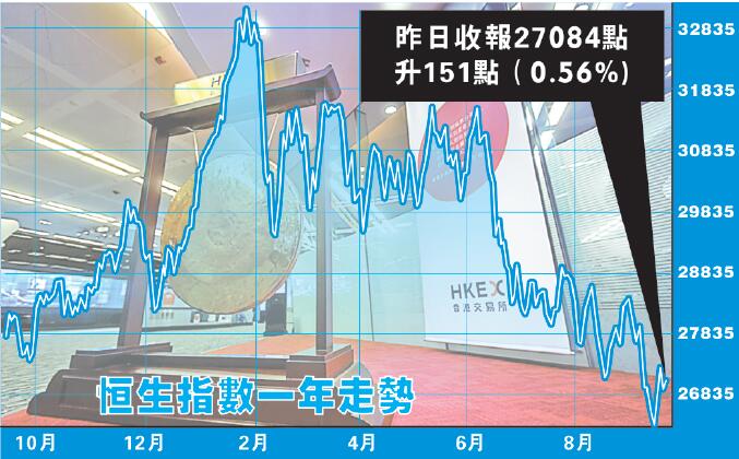 港股上周一受貿易戰影響低開,內銀股跟隨A股插水;8月內地手機市場出貨量跌逾兩成,拖累手機相關板塊,港股急瀉360點。上周二濠賭股遭德銀唱淡重創,加上國家發改委調研建材價格暴漲,令建材股全線下跌,港股再走低190點。上周三因內地擬實施藥品帶量採購試點,醫藥股重挫,港股又跌77點報26345點,曾見26219點創14個月新低。上周四傳出中美有望重啟貿易談判,加上騰訊(700)連日回購升近5%,賭股全線反彈,手機設備股在蘋果發布會後上揚,港股急漲669點。港股上周五反彈浪未止,汽車股、濠賭股、手機設備股等累跌板塊繼續向上,內需股亦隨市回勇,恒指午後曾高扣27340關,全日波幅313點,最終收報27286點,上升271點(1.01%)。