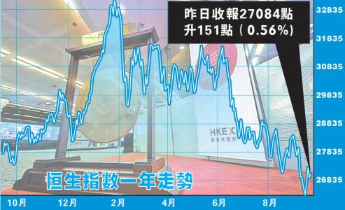 港股上周一受貿易戰影響低開,內銀股跟隨A股插水;8月內地手機市場出貨量跌逾兩成,拖累手機相關板塊,港股急瀉360點。上周二濠賭股遭德銀唱淡重創,加上國家發改委調研建材價格暴漲,令建材股全線下跌,港股再走低190點。上周三因內地擬實施藥品帶量採購試點,醫藥股重挫,港股又跌77點報26345點,曾見26219點創14個月新低。上周四傳出中美有望重啟貿易談判,加上騰訊(700)連日回購升近5%,賭股全線反彈,手機設備股在蘋果發布會後上揚,港股急漲669點。港股上周五反彈浪未止,汽車股、濠賭股、手機設備股等累跌板塊繼續向上,內需股亦隨市回勇,恒指午後曾高扣27340關,全日波幅313點,最終收報27286點,上升271點(1.01%)。
