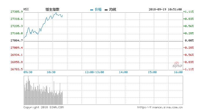 9月19日消息,港股恒指涨幅扩大,截至发稿,恒生指数(27356.34, 271.68, 1.00%)涨0.95%,报27342.73点;国企指数涨1.42%;红筹指数涨1.24%。蒙牛乳业(23.4,0.95, 4.23%)涨4.45%,报23.45港元,领涨蓝筹。