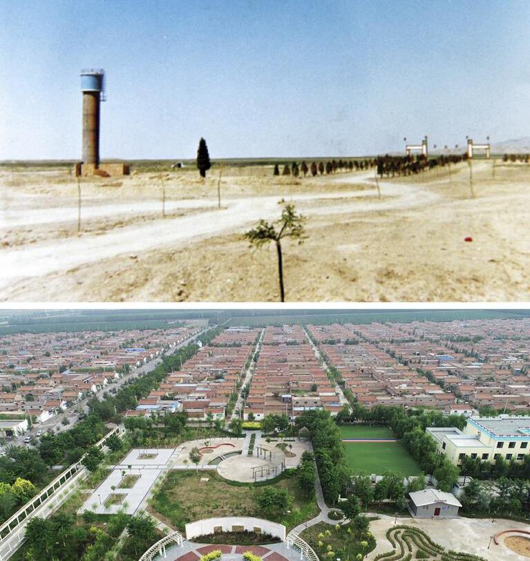 拼版照片:上图为宁夏银川市永宁县闽宁镇建设初期的资料照片;下图为8月17日无人机拍摄的宁夏银川市永宁县闽宁镇原隆村(新华社记者王鹏摄)。受益于福建、宁夏多层次、多形式、宽领域、全方位的扶贫协作,闽宁镇这片曾经的戈壁荒滩,被建设成现代化的生态移民示范镇。6万多名曾经生活在西海固贫困山区的农民陆续走出大山搬入闽宁镇,通过移民搬迁走上了脱贫致富之路。 新华社发
