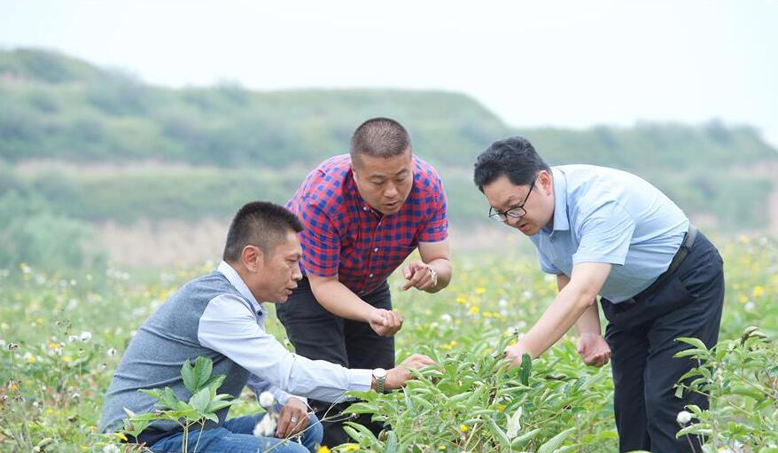 来自福建长乐的林锦云(中)在宁夏固原市河川乡与福建对口支援农业专家(右)交流牡丹种植技术(8月28日摄)。2014年,林锦云通过土地流转方式,承包了河川乡1.5万亩荒山,打造油用牡丹生产基地。目前,林锦云种下的7600亩油用牡丹已经开始产生效益,公司已就近吸纳村民300多人就业,其中建档立卡贫困户39户,人均年收入2万多元。 新华社记者姜克红摄