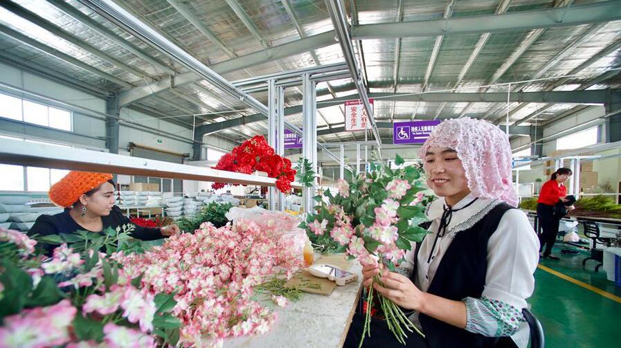 工人在宁夏隆德人造花工艺有限公司制作人造花(8月29日摄)。位于六盘山脚下的宁夏隆德人造花工艺有限公司是2013年隆德县引进的闽宁对口扶贫协作项目,生产用于家居、婚庆及各类节庆的人造花饰品,产品销往欧洲、中东及东南亚等地区,实现出口创汇的同时带动当地百姓脱贫增收。 新华社记者姜克红摄