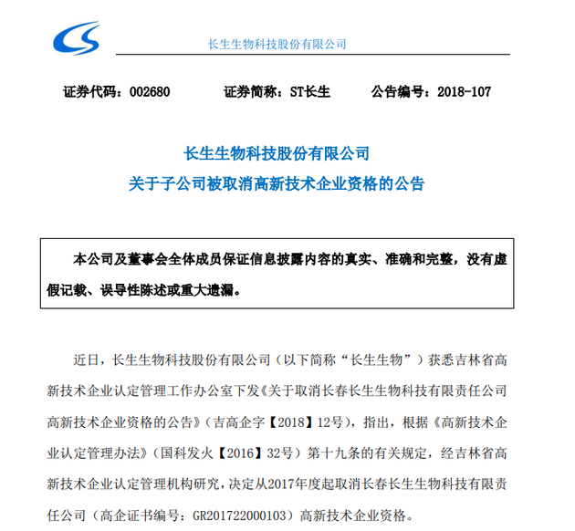 9月19日午间消息,长生生物(002680.SZ)发布公告称,吉林省高新技术企业认定管理工作办公室下发《关于取消长春长生生物科技有限责任公司高新技术企业资格的公告》,指出,根据《高新技术企业认定管理办法》(国科发火[2016]32号)第十九条的有关规定,经吉林省高新技术企业认定管理机构研究,决定从2017年度起取消长春长生生物科技有限责任公司高新技术企业资格。