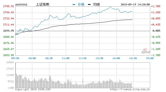 9月19日,A股三大股指午后持续走高,涨幅扩大。创业板指重回1400点上方。截至13点45分,上证指数报2741.01点,上涨41.06点,涨1.52%,成交额1010.16亿;深证成指报8302.85点,上涨169.63点,涨2.09%,成交额1294.91亿,两市合计成交额2305.06亿;创业板指报1403.39点,上涨26.09点,涨1.89%,成交额371.94亿。