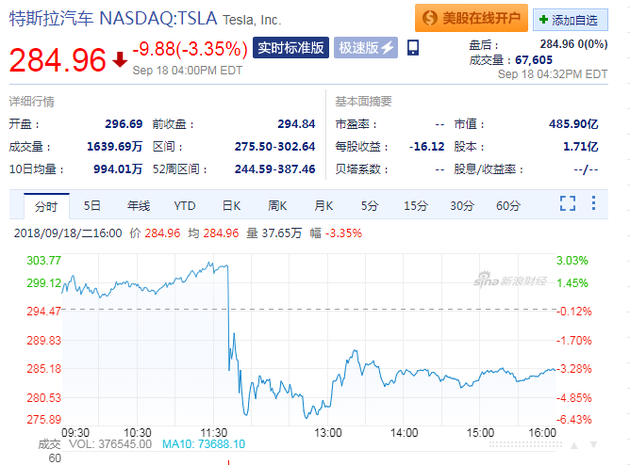 北京时间9月19日凌晨消息,特斯拉周二收盘报284.96美元,下跌3.35%。