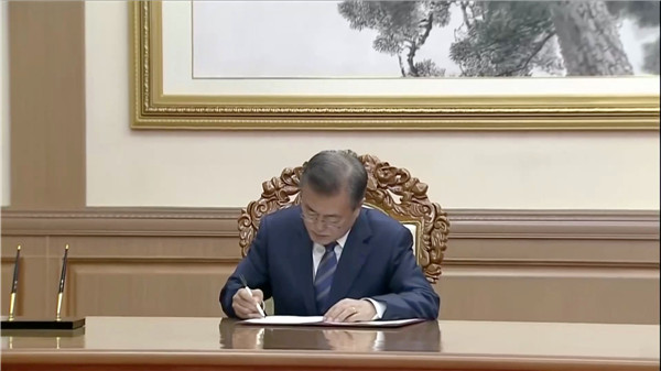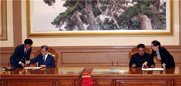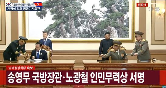 之后,在金正恩和文在寅的共同见证下,朝鲜人民武力相努光铁与韩国国防部长官宋永武共同签署名为《关于落实板门店宣言中军事领域共识的协议》的军事协议。