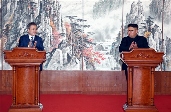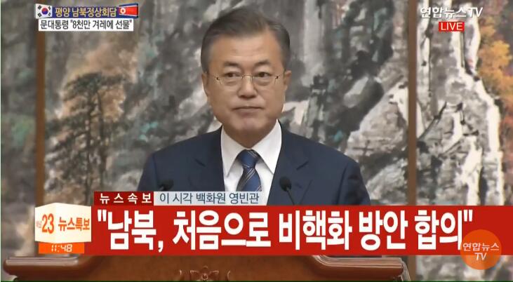 金正恩在记者会上表示,《平壤共同宣言》将朝韩关系提高到了新的水平,宣言将推进和平、繁荣的新时代。他承诺致力于打造没有核威胁的朝鲜半岛。