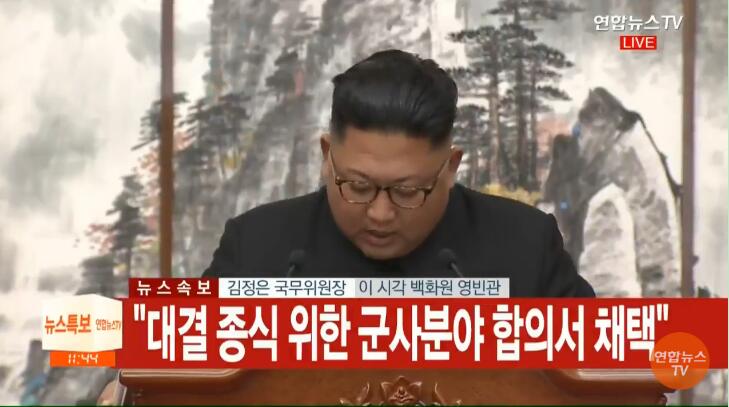 金正恩表示民族命运将由我们自己决定,为了结束敌对关系签署了军事协议,前方我们仍将面对挑战和困难,朝韩将携手向繁荣和平,不久将访问首尔。