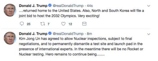 特朗普说:“金正恩同意接受核查,服从最后协议,在国际专家在场的情况下永久拆除一个试验场和发射平台。同时不会再有火箭和核试验。”