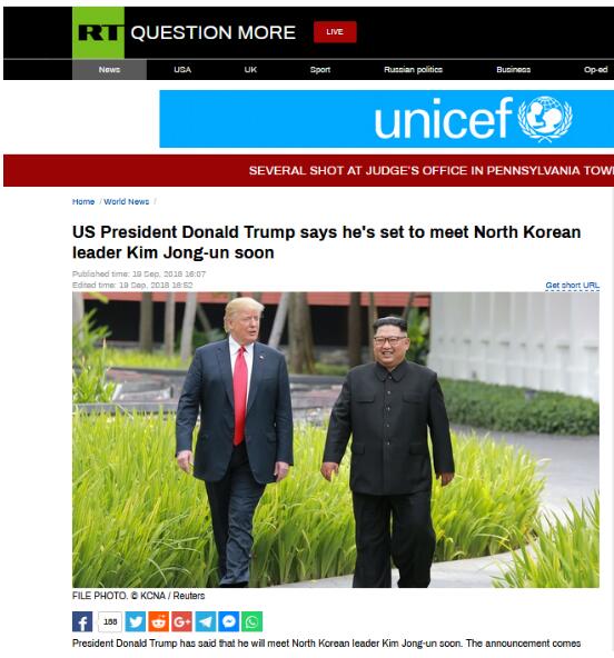 【环球网报道 记者 赵建东】据今日俄罗斯电视台19日报道,美国总统特朗普周三在接受记者采访被问及是否很快与朝鲜领导人金正恩会面时表示:“我们将会很快见面。”