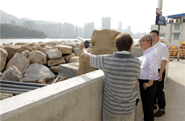 此外,民政事務局局長劉江華昨午到維園及鯉魚門一帶,視察各項善後工作。他首先到維園了解颱風襲港後的清理工作,以確保中秋綵燈會可如常舉行;其後他在觀塘民政事務專員謝凌駿、觀塘區議員呂東孩、鯉魚門地區居民組織代表等陪同下,到訪鯉魚門一帶視察政府為應對風暴所作的準備,包括風暴期間用作臨時庇護中心的鯉魚門體育館、防浪防洪設施等。他亦視察村落受影響的情況,並慰問居民和商戶。