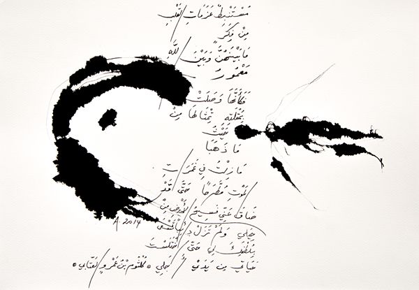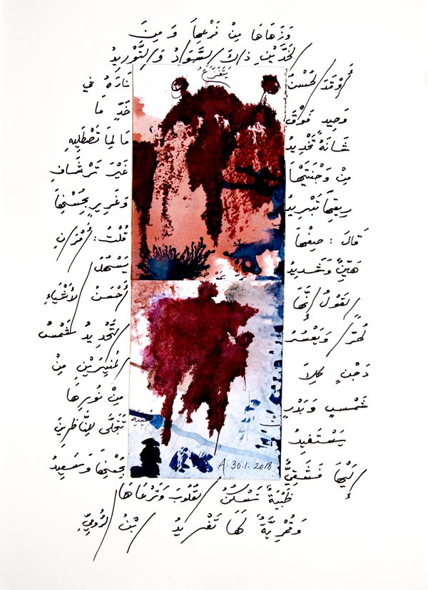 事實上,阿多尼斯的畫分為兩類,一類是拼貼,另一類是水墨,阿多尼斯喜歡叫它們「視覺作品」。但他不喜歡作品的「完成」這個概念。阿多尼斯認為,這些視覺作品是「未完成的」,是向各種闡釋「敞開着的」,是詩歌在另一種形式中的延伸。這種「延伸」導致了一些「圖形」,而這些「圖形」又是無限量地變化着的。不變的是背景,始終由「文字」相伴:他用阿拉伯文寫的古代詩人的詩句,或者他自己的詩句。
