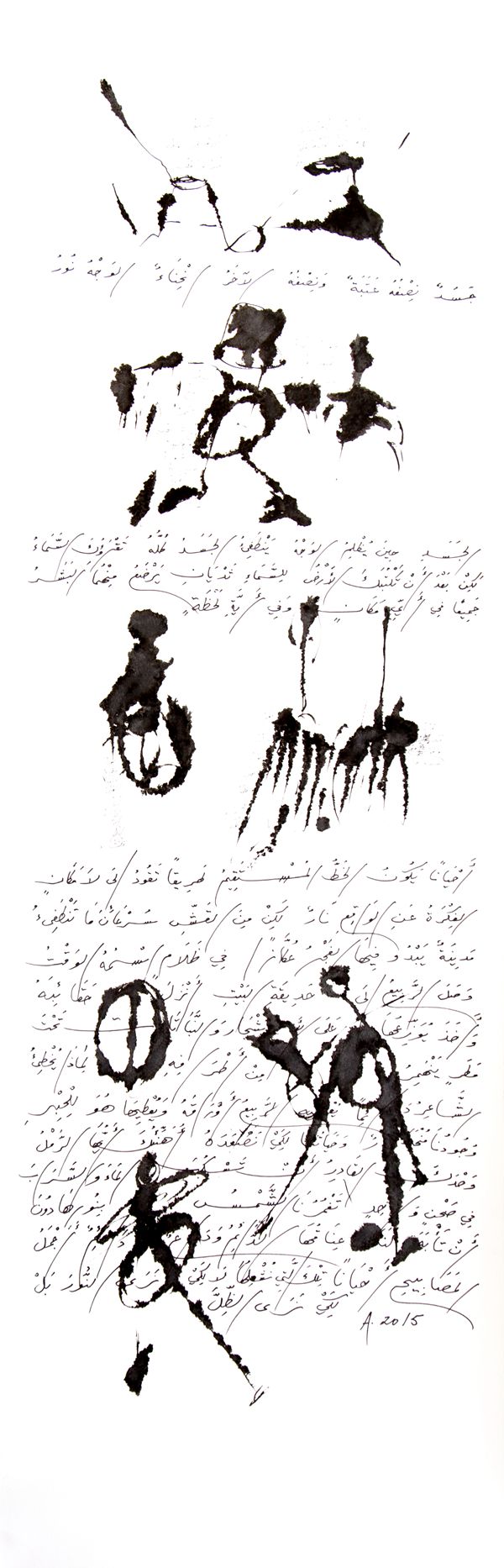 從上世紀90年代中期開始至今,阿多尼斯的視覺藝術是一個由詞與物構成的謙和而高貴的不朽之作。他的早期作品好比約瑟夫·康奈爾(Joseph Cornell)的盒子:是小石頭、小木塊、拾得物和剩餘金屬的容器。阿多尼斯把它們組合在一起,賦予它們形態,不知有意無意,通常是人形,並添上詩歌——他詩歌博物館的一部分。隨着這系列的不斷延伸,表現手法也在改變,他開始用墨水和水粉。他的這種藝術實踐是詩人向我們發出的一個小小宣言,呼籲一種更開放、更含蓄、更微妙、更能持久的詩歌藝術。阿多尼斯的佳作讓人看到,在一個超越文化和時代,超越生命的地方,世界和文字終於完美合一。