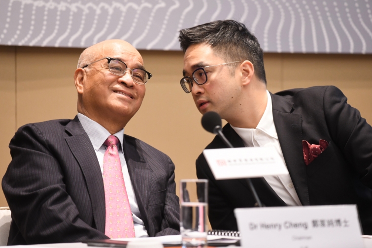 新世界主席郑家纯(左)及执行副主席郑志刚昨一同出席业绩发布会,期间言谈甚欢。记者 崔俊良摄